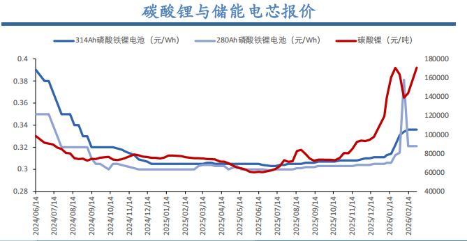 最后,反内卷趋势下,碳酸锂价格企稳回升,优质储能电芯出现供不应求局面,280Ah和314Ah储能铁锂电芯均实现提价。行业集中度维持高位,电芯CR10接近89%,宁德时代、海辰储能、亿纬锂能等头部企业占据主要市场份额。